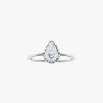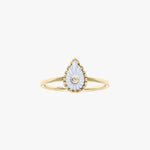 Myrtho est une bague délicate qui met en valeur une petite goutte de nacre, ciselée à la main par un joaillier, finement entourée d’un contour texturé et éclairée en son centre par un diamant naturel.