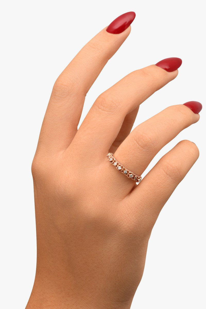 Les diamants ronds sont sertis en alternance, chacun entouré d’un contour ciselé finement travaillé, évoquant la délicatesse d’une dentelle ancienne.
