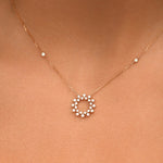 Le collier Inès illumine le décolleté avec une élégance aérienne. Son pendentif central, délicatement ajouré et orné de diamants scintillants, évoque un soleil à la fois graphique et raffiné.