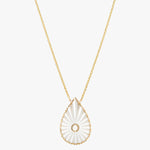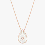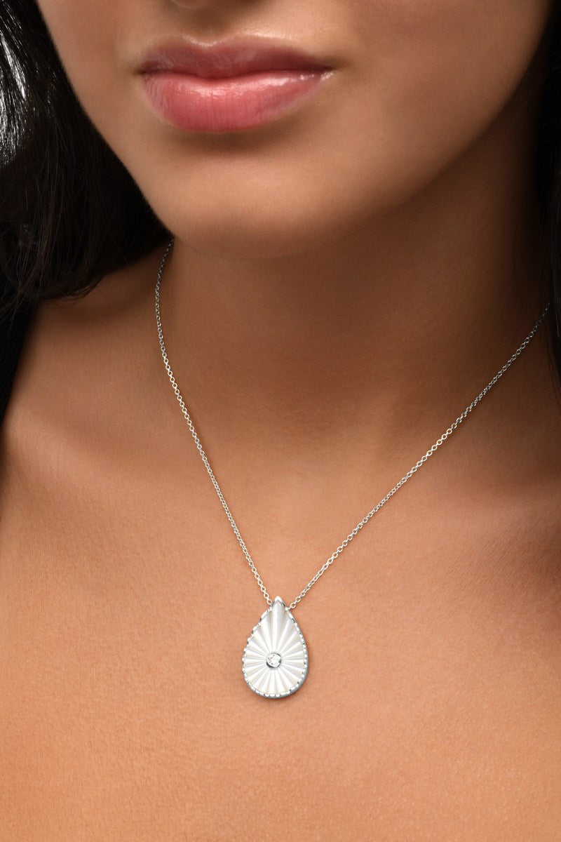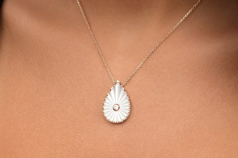 Tout en finesse, le collier Myrtho met à l’honneur une goutte nacrée lumineuse, subtilement irisée, soulignée d’un contour texturé et d’un diamant naturel central.